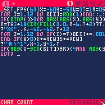 _set_fps(60)x=-60y=-50w=0t=1m=0s=9999camera(-64,-64)b={}u={1,0,-1,0}v={0,1,0,-1}